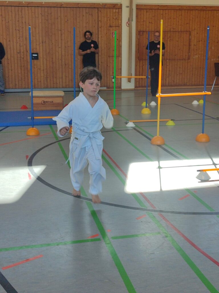 die jungen Karateka über Hindernisse springen, unter Stangen durchkrabbeln, verschiedene