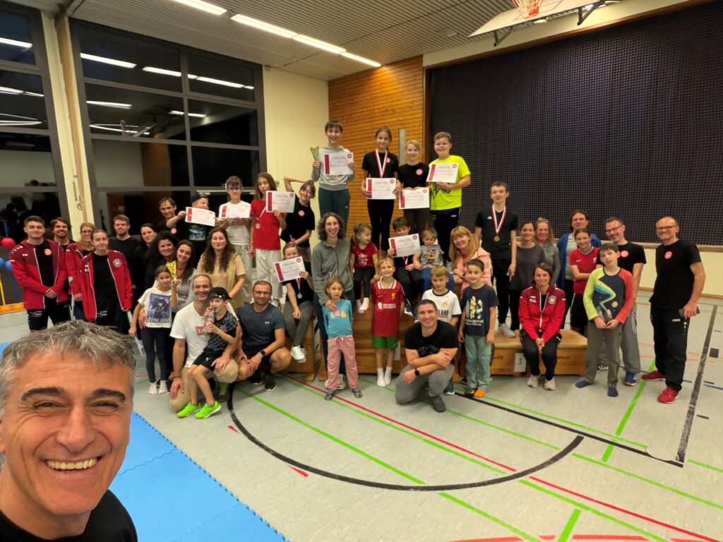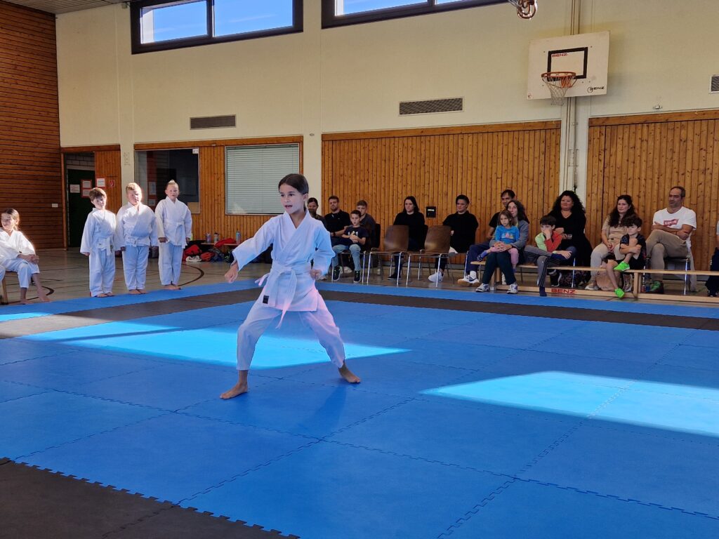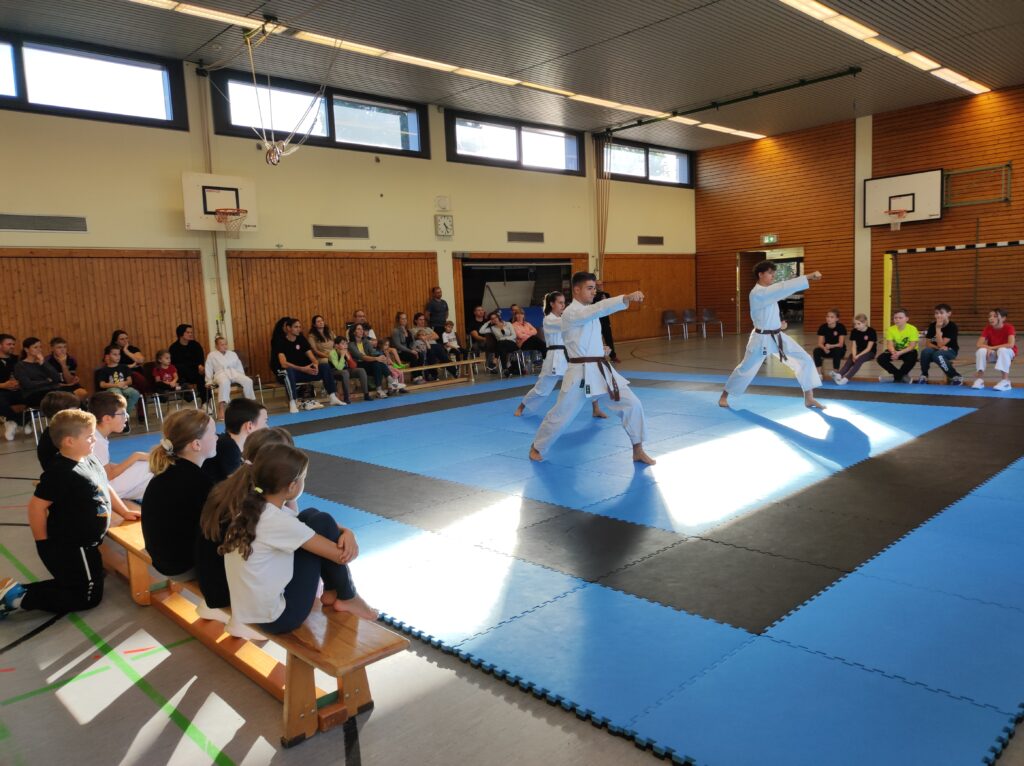 Nach einer Kuchen- und Kaffeepause präsentierten Tim, Paul und Emilia, aus der Wettkampfgruppe, gemeinsam eine Kata. Im Kumite zeigten sie, wie später der Freikampf schnell, kraftvoll und flexibel aussehen kann. Ein abwechslungsreiches Abendprogramm, bestehend aus gemeinsamen Spielen, einem Völkerballturnier (Klein gegen Groß), Pizza, Kino für die Kids und gemütliches Beisammensein für die Erwachsenen rundeten den Tag ab.
