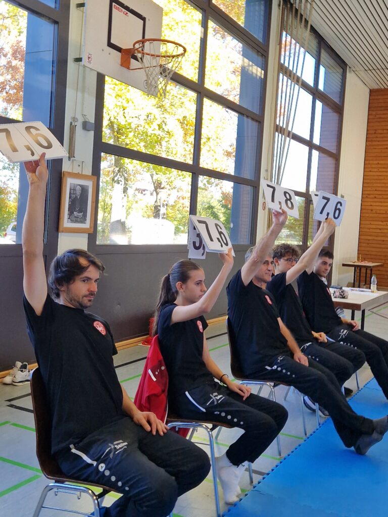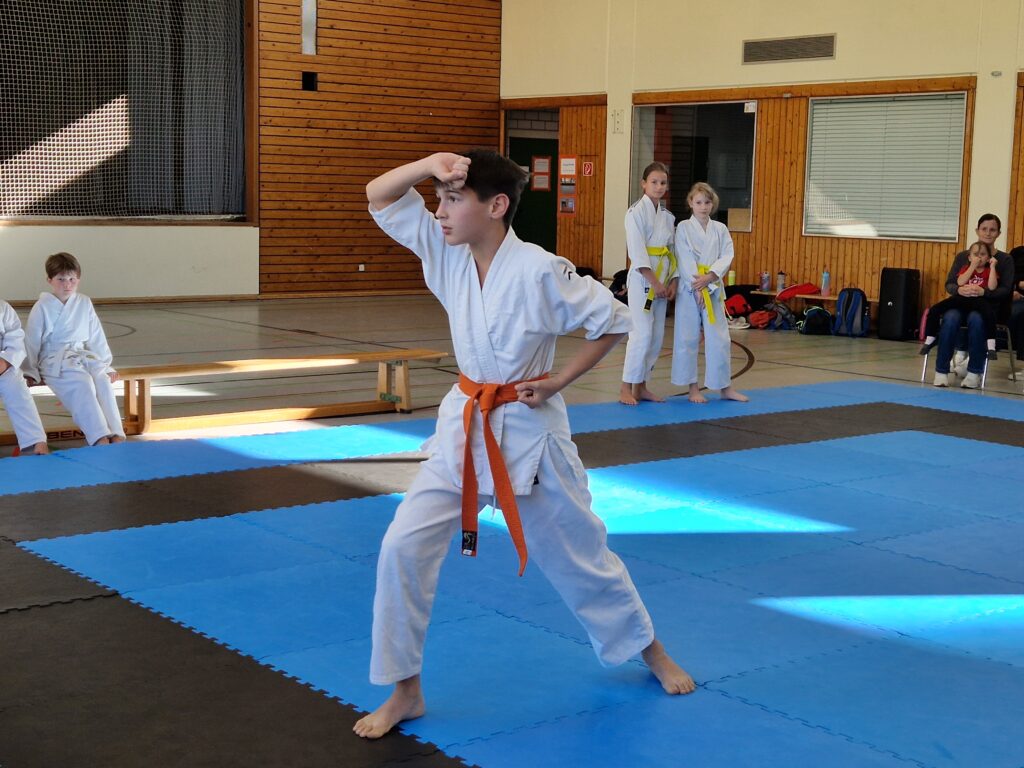 In der zweiten Disziplin zeigten die jüngsten Teilnehmer der Dojomeisterschaft, sechs Grundschulbahnen. Die Fortgeschritteneren trugen eine Kata vor und unsere Jugendgruppe durfte zwei Katas vortragen bzw. „kämpfen“. Hierbei kam es sowohl auf eine saubere und starke Ausführung der einzelnen Techniken als auch den Ausdruck (Mimik und mentale Haltung) an.