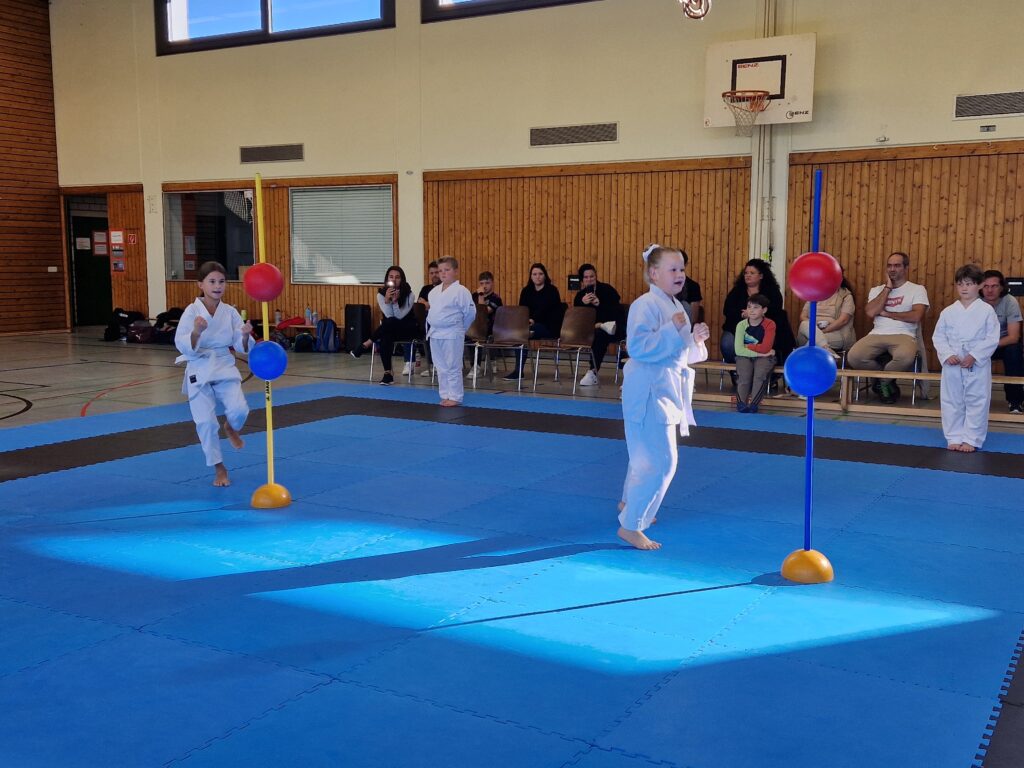 „Kumite am Ball“ ist eine Vorstufe. Hierbei traten die Kinder gegen keinen „echten Gegner“, sondern eine Stange, bestückt mit zwei Bällen, an. Einer der zwei Bälle symbolisiert dabei den Bauch und der zweite den Kopf des Gegners. Hier werden Fertigkeiten trainiert, die später im Freikampf mit „echten“ Gegnern benötigt werden. Bewertet wurden hierbei Technikvielfalt, Ausführung und Stärke der Technik und Treffsicherheit/Präzision. Die Eltern und Geschwister unterstützten natürlich lautstark als motivierende Begleiter.