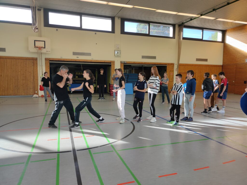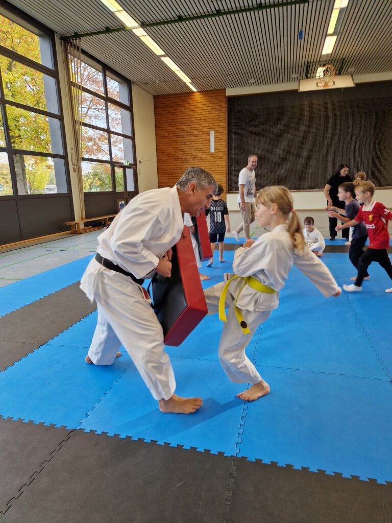 Am Sonntagvormittag trainierten die Eltern und Kinder 2 Stunden gemeinsam mit Jimmy und Nicolas. Die Kinder machten hier natürlich zwischen ihren Eltern alles vor und zeigten damit, wie anspruchsvoll Karate ist. In diesen zwei Stunden wurde ein Abriss des sehr großen Karate-Do Repertoire trainiert. Von einfachen Grundschulbahnen der ersten Techniken im Karate, über die einfachste Kata (außer man muss sie blind machen), bis hin zur „simplen“ Selbstverteidigungstechnik
